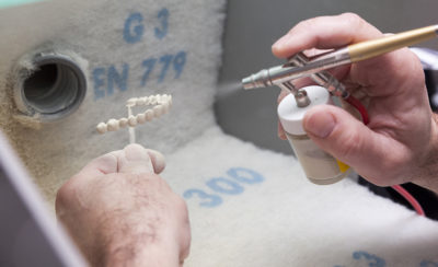La prothèse une fois imprimée, reçoit une teinte personnalisée ou classique réalisée par des techniciens spécialisés dans ce domaine.
